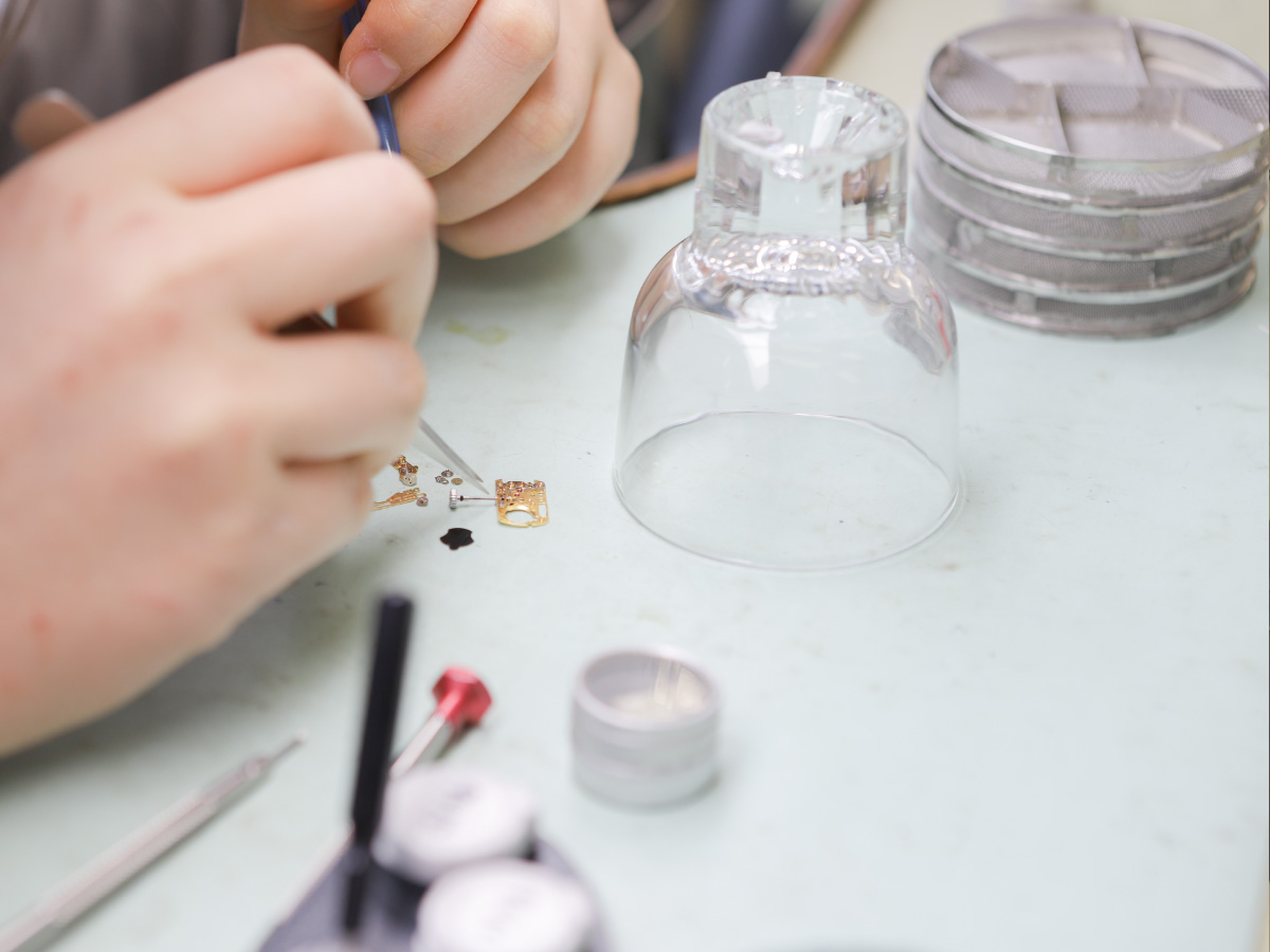 その後、必要な個所に必要な量の注油をしながら組み立てます。組立後は、文字盤や針などを所定の位置に取り付け、防水テストやランニングテストを行います。